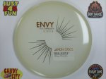 The Envy is a slightly overstable putt and approach disc. The Envy has a smooth modern feel that fits in the hand perfectly, lending confidence for both putt and approach duties. The Envy exhibits reliable high-speed stability and a minimal fade. With a slightly lower profile and cruising speed than the Ion and Anode class, the Envy is a uniquely “lid-like” stable putter. The Envy’s defining flight characteristic is its ability to hold a straight flight for power throwers, but also be a dependably stable approach disc for lower power throwers. Its medium depth offers a healthy balance of straight flight paired with an easy clean release. While its flight stability is largely similar to the MVP Ion, the Envy offers an entirely new feel. Its versatile stability on any type of shot will help the Envy find its way into every Axiom thrower’s bag.